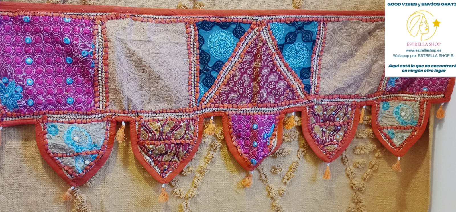 Un toque de tradición y elegancia en cada espacio. El Toran Bordado Patchwork es una pieza artesanal única, confeccionada en algodón con diferentes telas bordadas e hilos metálicos dorados que le aportan un brillo sutil y cómodo. Utilizado en la decoración tradicional hindú para embellecer puertas y atraer buenas energías, su versatilidad permite que también sea perfecto para decorar paredes, muebles, escaparates, mostradores o stands de mercado.