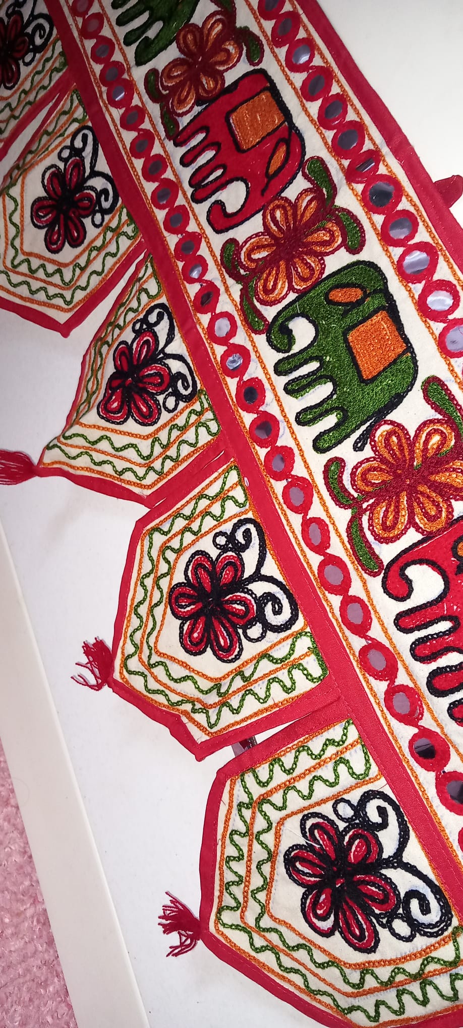 Un detalle que transforma cualquier espacio con esencia étnica y espiritual. El Torán Gora de 30x100 cm es una pieza elaborada artesanalmente en algodón con fondo color hueso, decorada con bordados coloridos y pequeños espejos que capturan la luz. Tradicionalmente usado en India para decorar puertas como símbolo de bienvenida y protección, hoy es ideal para paredes, escaparates, mostradores o como toque original en stands de mercado. Cada unidad es única, con composiciones distintas que harán que tu ambiente respire autenticidad y belleza.