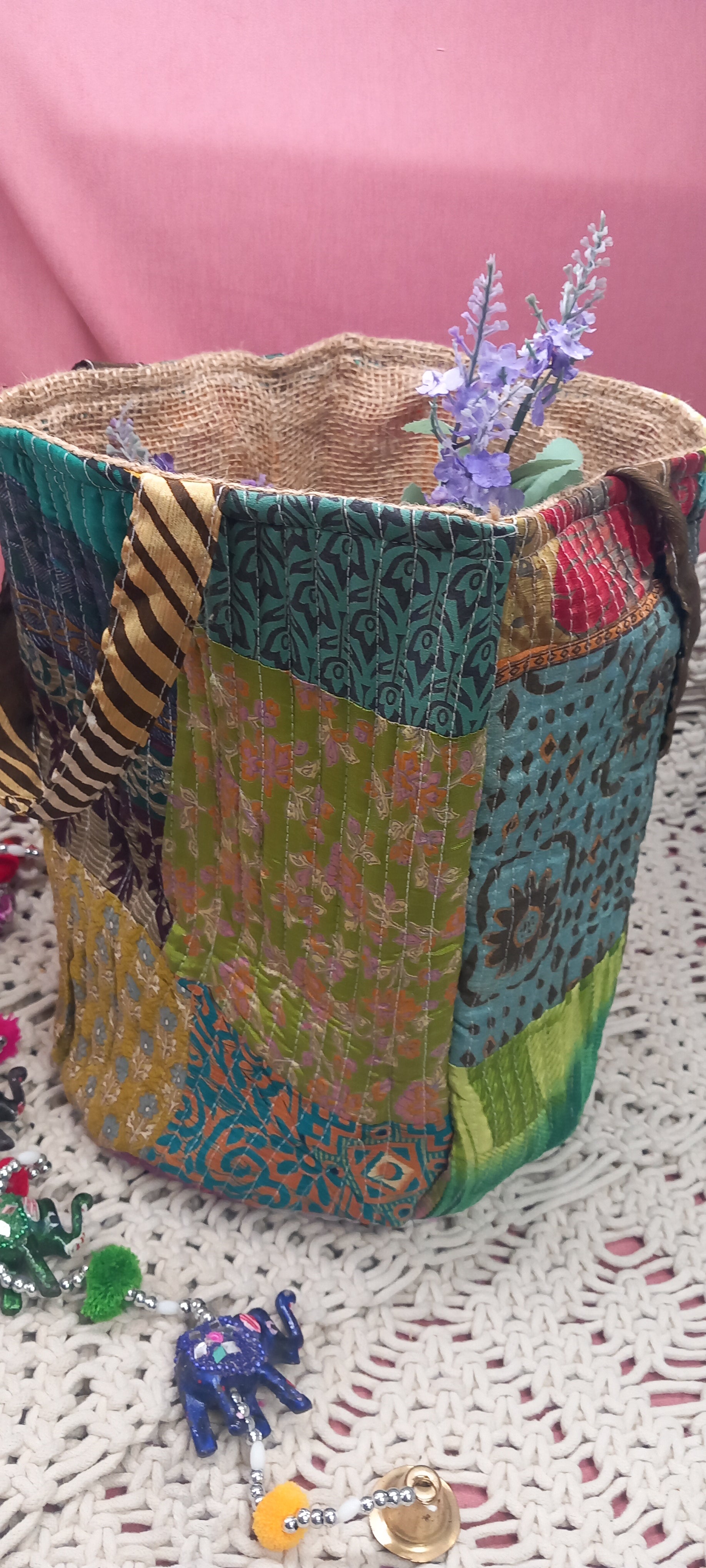El Cesto Wild Saree es una pieza artesanal única que combina funcionalidad, sostenibilidad y estilo en un diseño versátil. Confeccionado con telas sedosas recicladas de saree y yute, cada cesto es irrepetible gracias a sus vibrantes estampados elaborados con la técnica de patchwork. Con unas medidas de 25x30 cm, es ideal para usarlo como bolso con un toque bohemio o como elemento decorativo en el hogar, aportando color, personalidad y un aire auténtico de artesanía india.