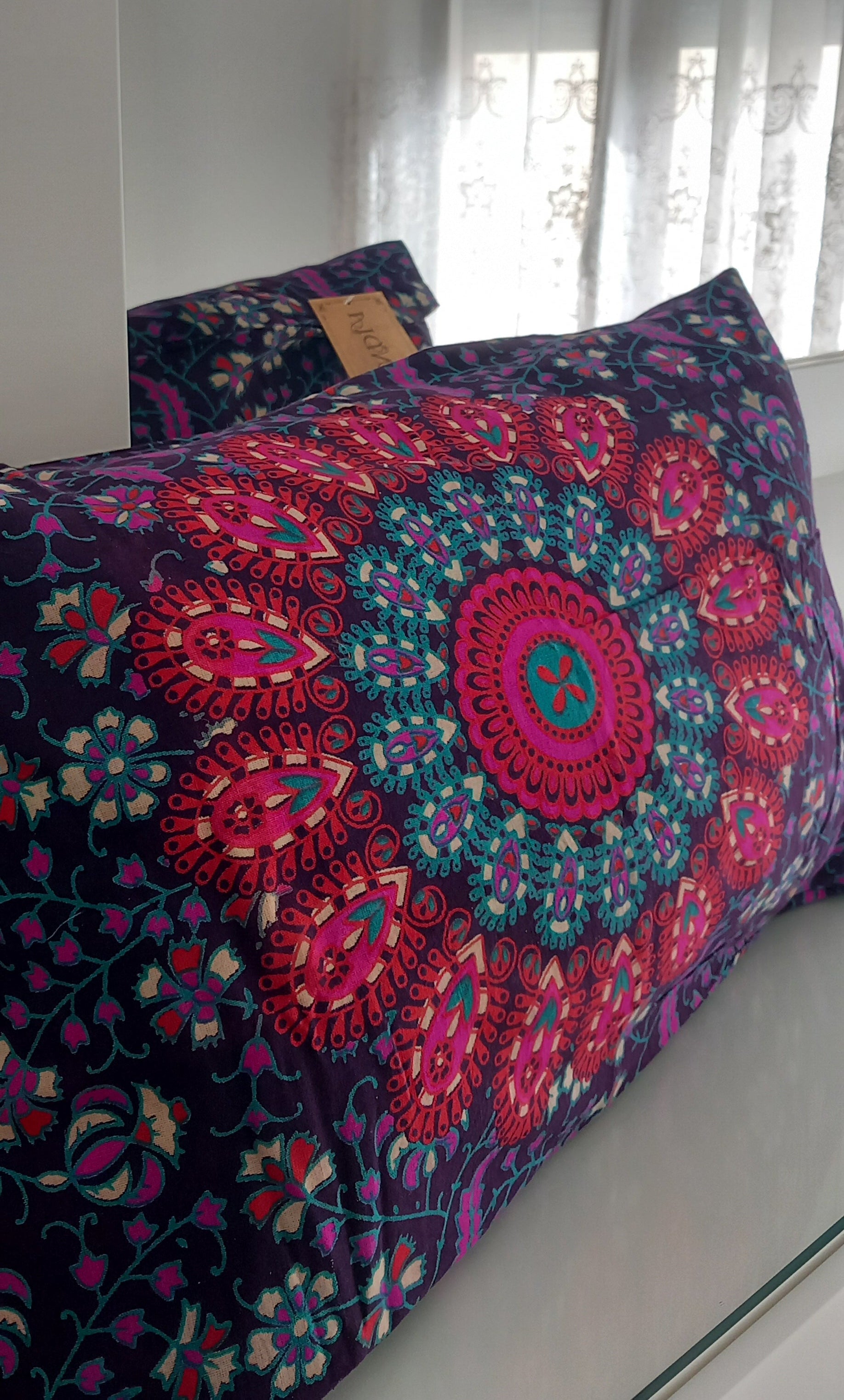 FUNDA DE COJÍN Y/O ALMOHADA. Una pieza textil que llena de vida cualquier rincón. La funda de cojín/almohada estampada (40x65 cm) está elaborada artesanalmente en algodón, con estampados coloridos y dibujos que transmiten alegría y originalidad. Cada modelo es una pequeña obra de arte textil que aporta un toque fresco y diferente a la decoración. Ideal para complementar rincones especiales con un aire bohemio y artesanal.