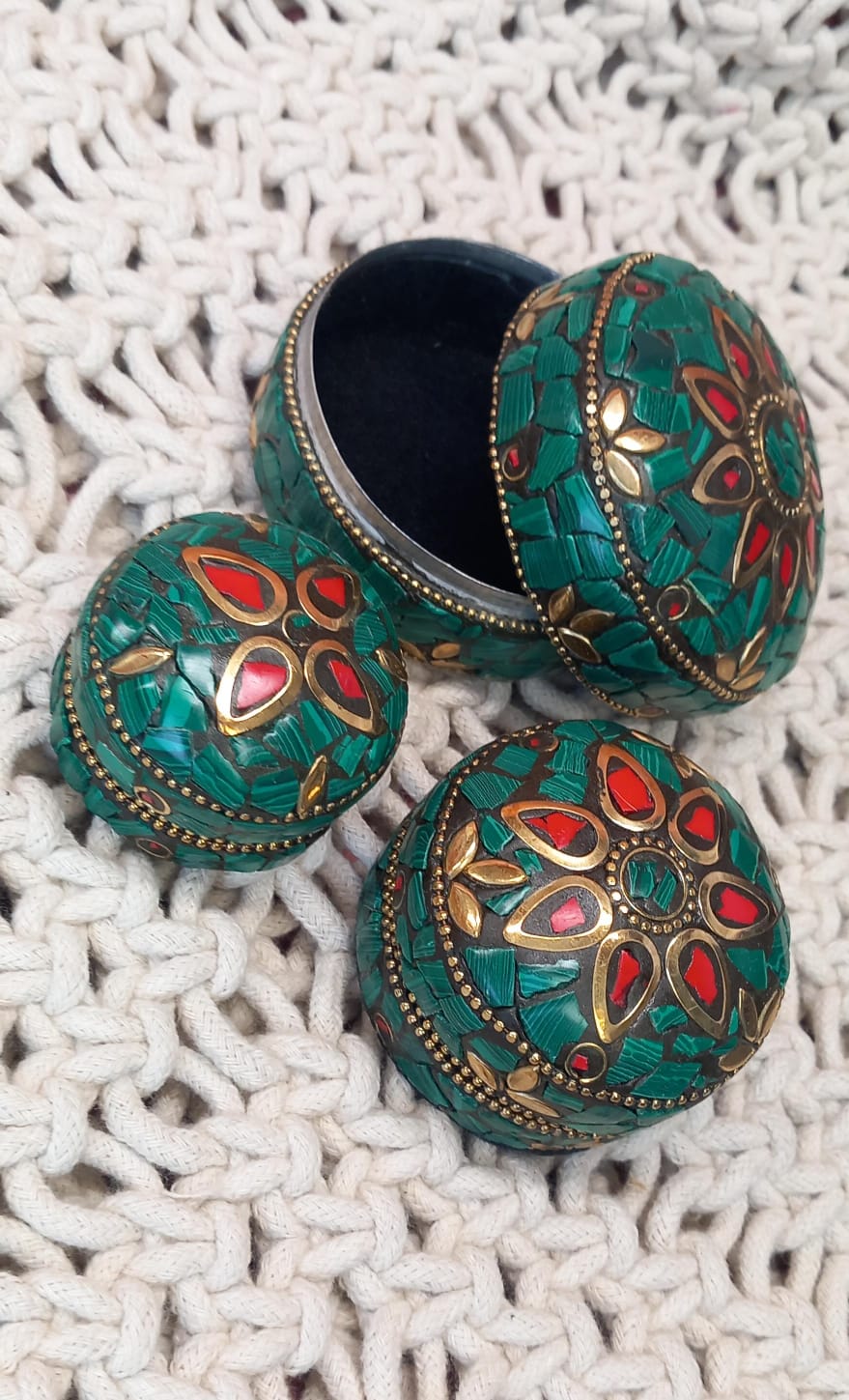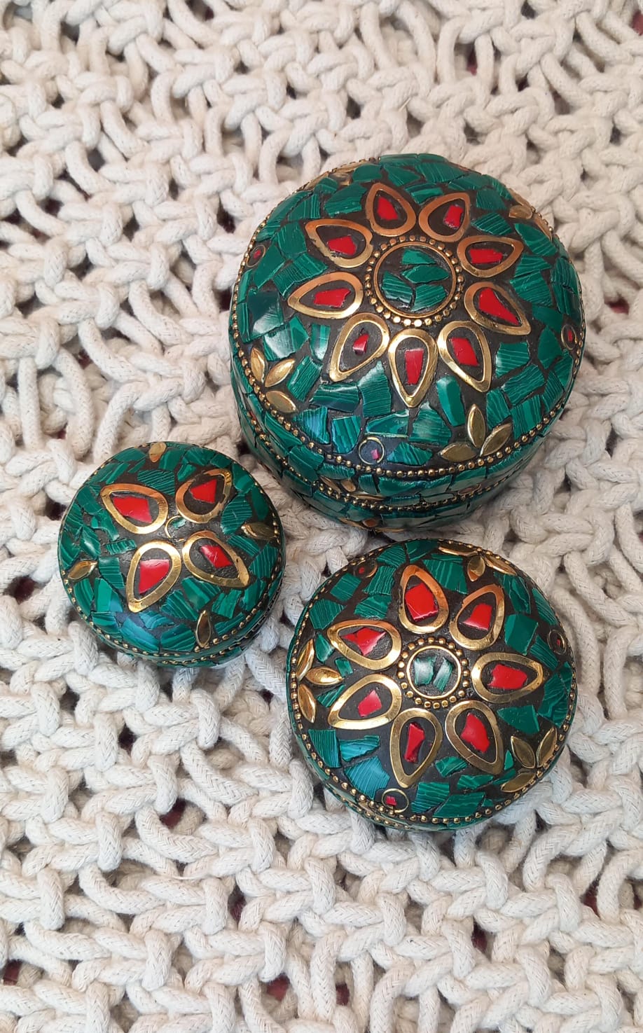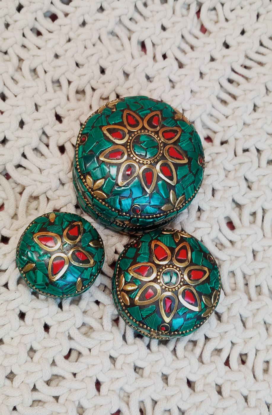 Un set que combina artesanía, brillo y un encanto único. El set de cajas Navarantha incluye tres cajas redondas de diferentes tamaños (7, 6 y 5 cm aprox), todas decoradas a mano con un mosaico de minerales que convierte cada una en una pieza irrepetible. Su acabado artesanal, lleno de color y textura, las hace ideales como joyeritos, para guardar pequeños tesoros o como piezas decorativas. Una propuesta exquisita para ti, perfecta para clientas que buscan detalles originales y con alma.