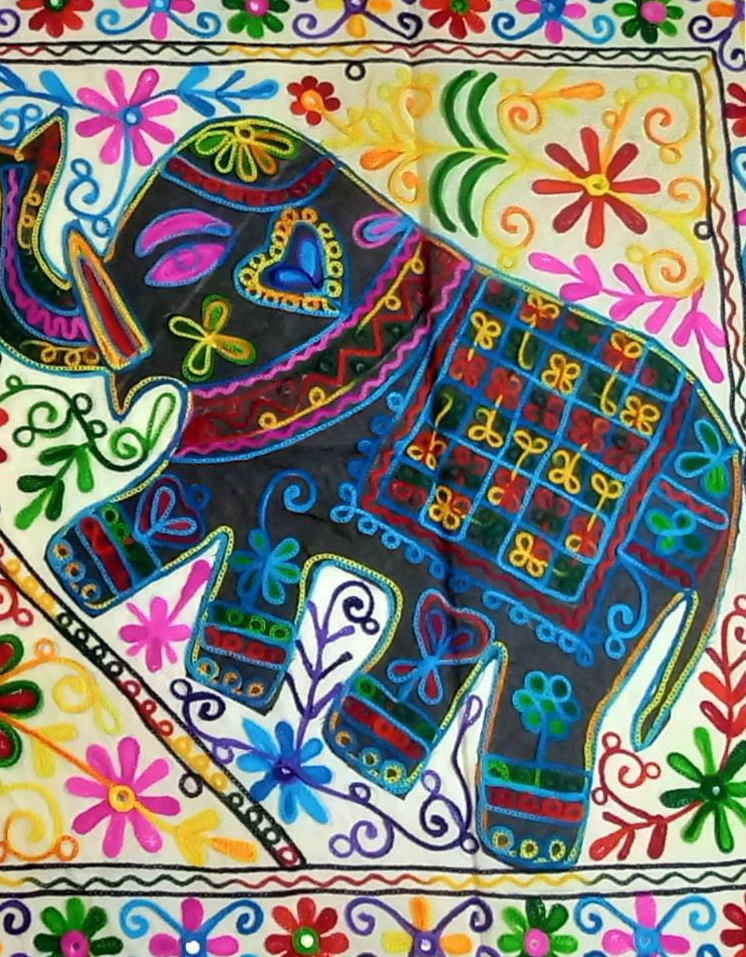 Una pieza artesanal que transmite fuerza, armonía y belleza en cada puntada. El tapiz Gora 90x130 cm con motivo de elefante está elaborado artesanalmente en algodón, bordado con hilos de colores vivos que contrastan con el fondo blanco. Combina flores y la figura del elefante, símbolo de protección y sabiduría, en un diseño rectangular que embellece cualquier espacio. Su borde puede variar, lo que aporta a cada unidad un carácter completamente único.